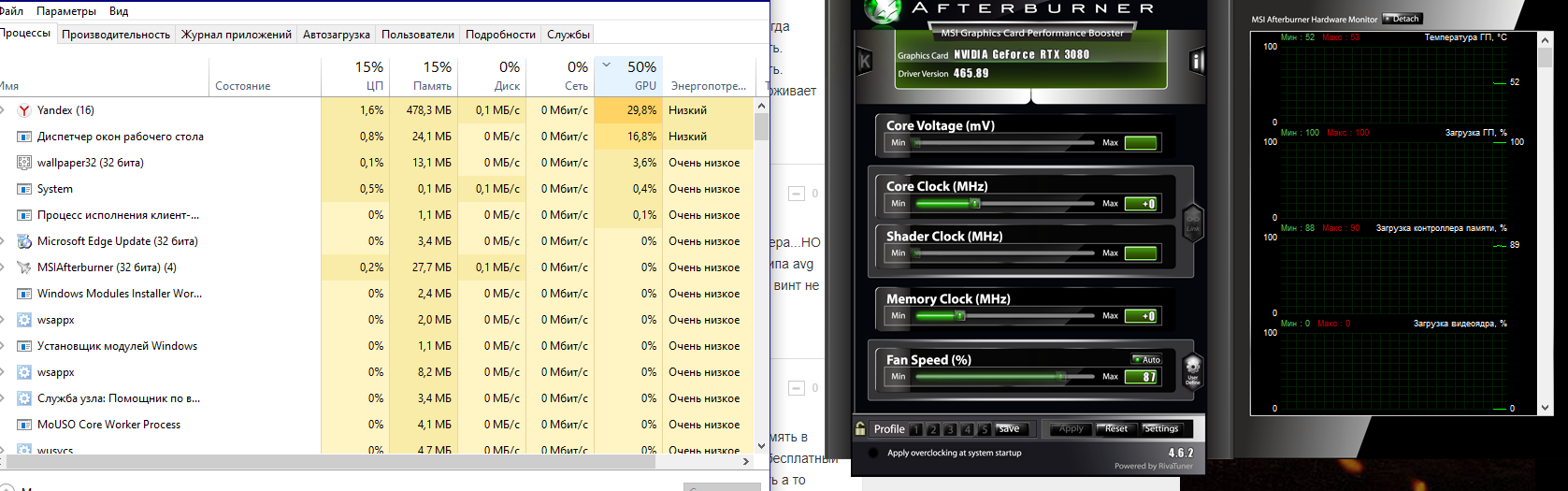 Вторая проблема началась совсем недавно когда температура моей видеокарты выше 55 градусов, она автоматически повышает оборот крутилок. Никаких проблем не было, а тут вдруг сама по себе, без каких либо дополнительных процессов, вообще в любое время может повысить оборот, в msi afterburner показывает температуру 51, загрузку гп и контроллера 100% , видеоядра 0%
