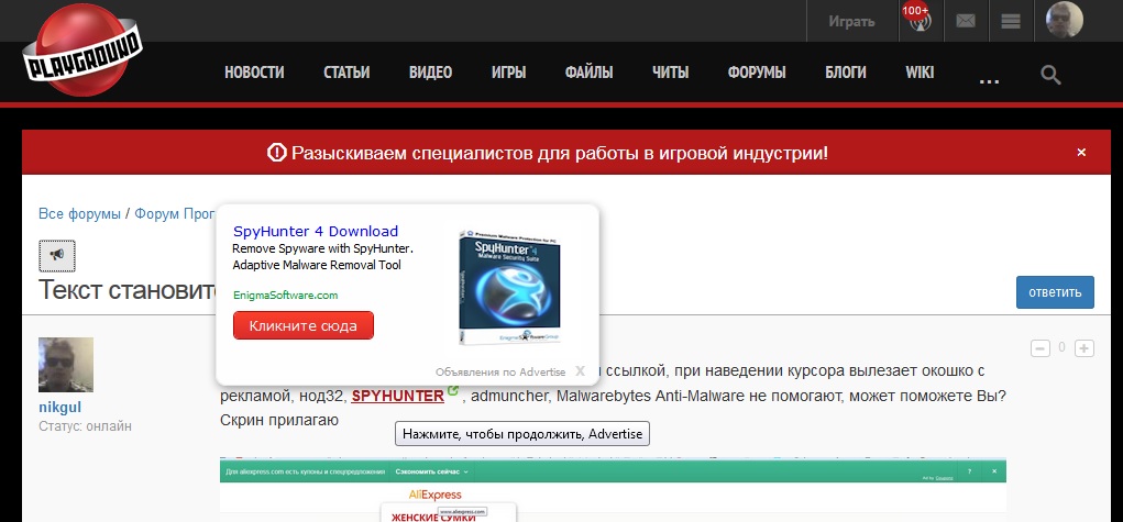 Преимущественно на алиэкпресс текст становиться ссылкой, при наведении курсора вылезает окошко с рекламой, нод32, spyhunter, admuncher, Malwarebytes Anti-Malware не помогают, может поможете Вы? Скрин прилагаю