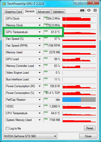...а если охота узнать максимальные значения не следя за ними постоянно, достаточно до игры включить GPU-Z. На вкладке "Сенсоры" установить все значения на максимум (либо в настройках сделать так чтобы программа сразу запускалась на этой вкладке с такими значениями), свернуть в трей и запустить игру. После игры открыть и посмотреть что показывает.