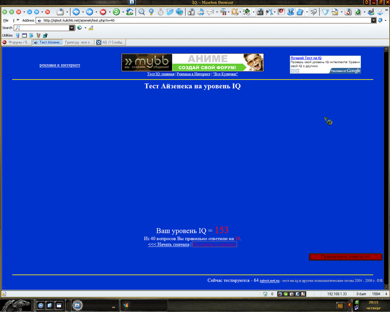 Поголовная проверка IQ посетителей болталки, такой темы еще вроде не было, давайте не стесняйтесь 70 балов и вы уже не удот))