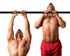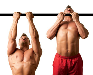 Ладони на ширине плеч, не шире. Задействованы бицепсы, середина широчайших, есть нагрузка на предплечья. Обязательно сводим лопатки сзади и касаемся грудью турника.