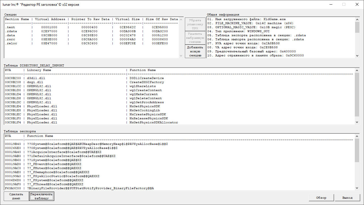 - кнопка удалить секцию и Снять дамп пока что не готовы к релизу (наброски кода есть, но нужно править);