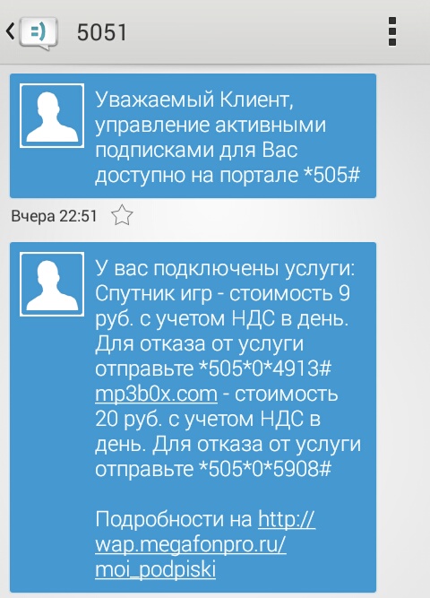На номер 5051 отправляем SMS *505# чтоб запросить информацию о подписках.