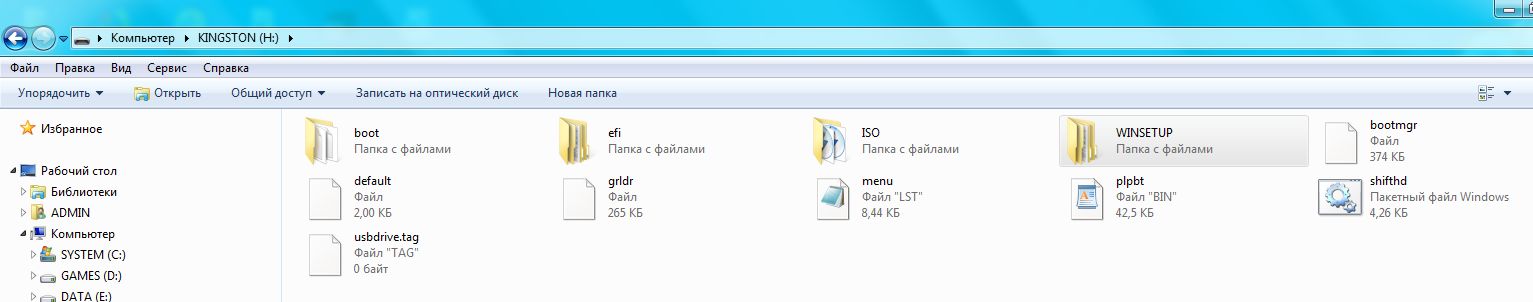 Та программа, которой себе "закидываю", так и делает - копирует образы и создаёт дополнительный загрузчик (с папками и меню) к ним ("чистого" образа, без ничего, одним файлом не будет). Полностью записанная флешка у меня выглядит так: