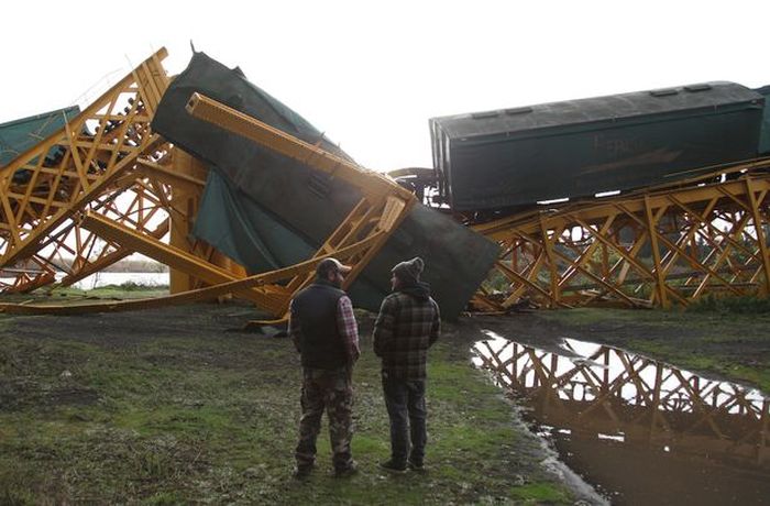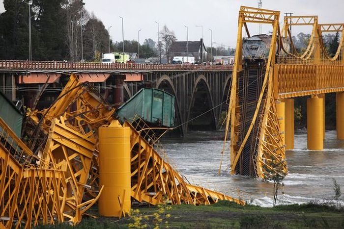 В чилийском районе Араукании рухнул железнодорожный мост через реку Тольтен. Инцидент произошел в тот момент, когда по мосту проходил товарный поезд. Опоры не выдержали тяжести и перекрытия вместе с вагонами и цистернами оказались в воде.