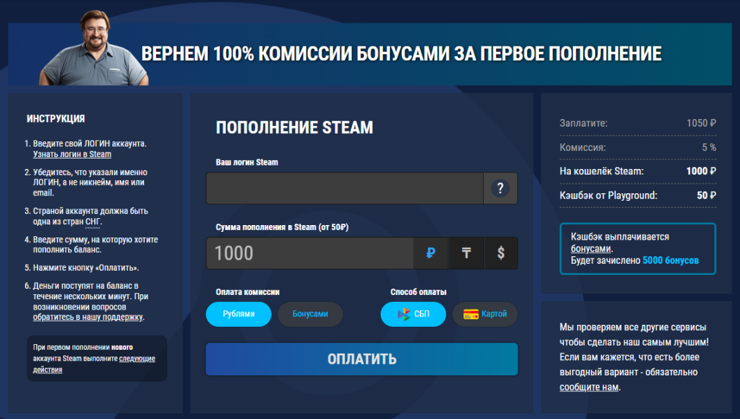 Портал PlayGround.ru также предлагает удобный и выгодный способ пополнения баланса Steam аккаунта, позволяя без особых задержек оплачивать игры, дополнения и внутриигровые товары.