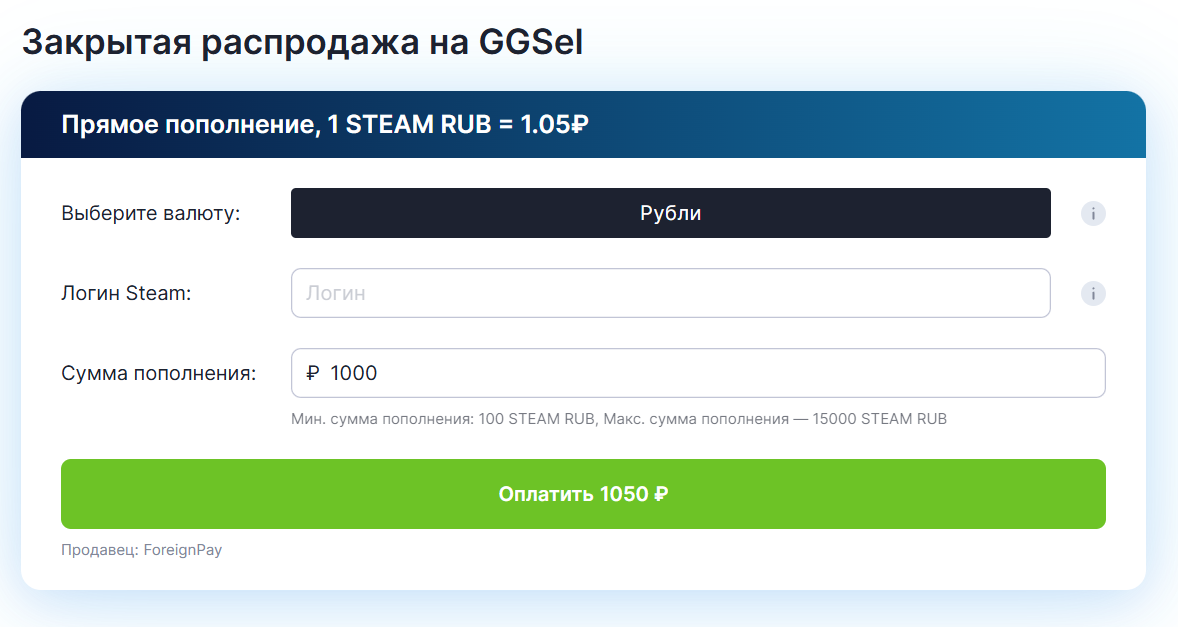 Пополнение Steam кошелька через ggsel с комиссией 5%