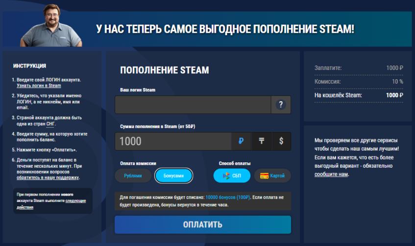 Пользователю необходимо ввести логин и сумму, которую он хочет получить. При нажатии на кнопку оплаты можно увидеть итоговую сумму, которая выше на 10-12% из-за комиссии сервиса и конвертацией от Steam. Сама оплата осуществляется стандартным методом по QR-коду.