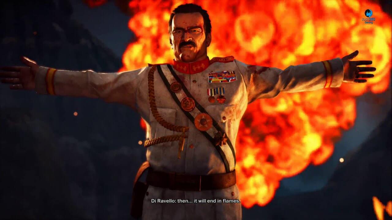 Генералиссимус Ди Равелло – последний босс в Just Cause 3. И если разработчики хотели, чтобы битва с ним оказалась по-настоящему взрывным финалом, то для вас она может стать делом полминуты. Просто используйте трос, чтобы погрузить вертолёт вместе с боссом в лаву, а там она уже сама со всем разберётся.