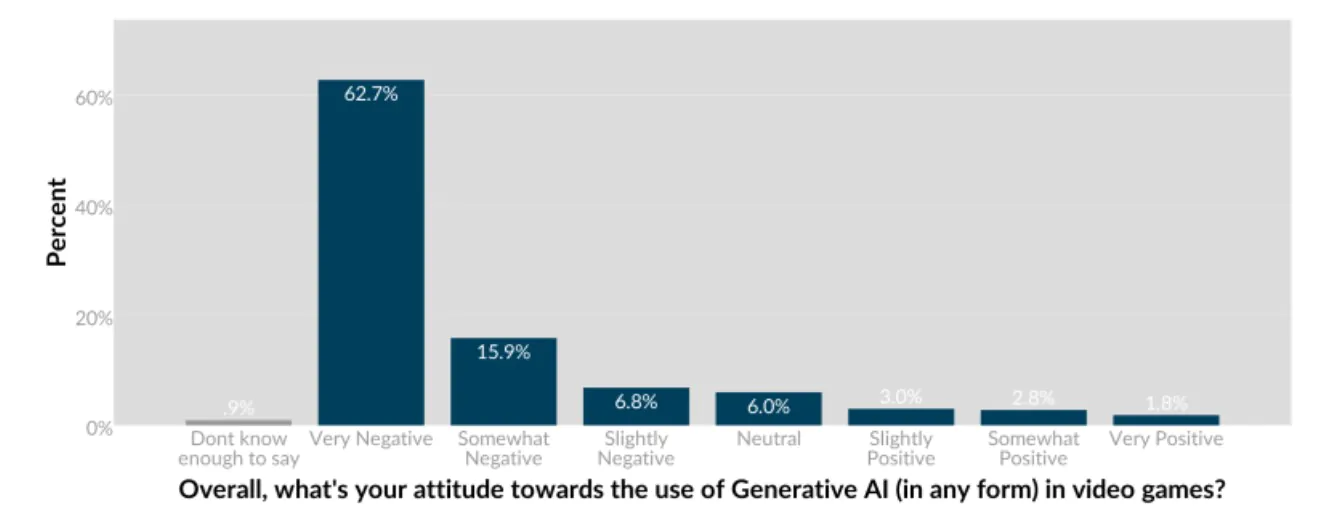 Недавно Quantic Foundry провела опрос, который показал, что 63% игроков имеют «очень негативное» мнение об использовании генеративного ИИ в разработке игр. В целом, 85% ответов были негативными, в то время как только 7,6% участников положительно отреагировали на применение генеративного ИИ.