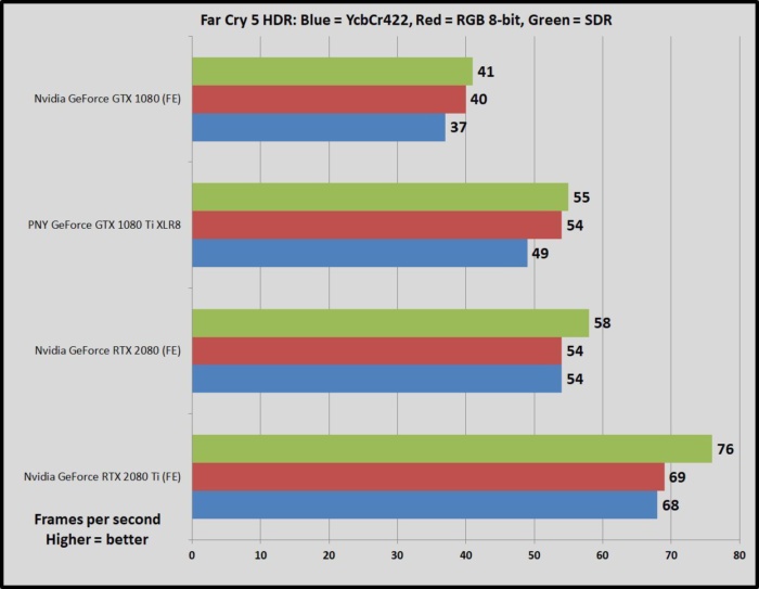 Listoman У Nvidia проблемы с FullRGB при активации HDR ))) https://www.pcworld.com/article/3307102/components-graphics/nvidia-geforce-rtx-2080-and-rtx-2080-ti-review.html?page=8 SDR производительность больше в HDR но это не FullRGB различие в цвете капитальное тоесть бледная картинка будет ! Недавно тестил на IPS Nvidia 10XX линейку бледное говно ты хоть цветность меняй 0-255 не помогает )))
