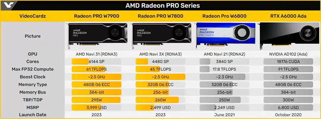 Как и предполагалось, старшая Radeon Pro W7900 использует полновесную версию GPU Navi 31 c 96 CU-блоками (6144 потоковых процессоров) и 384-битной шиной, и технически близка к игровой Radeon RX 7900 XTX. Главное отличие заключается в объёме видеопамяти – 48 ГБ GDDR6 с поддержкой кода коррекции ошибок. Заявлена вычислительная мощность до 61 Тфлопс при уровне TDP 295 Вт. Рекомендованная стоимость $4000.