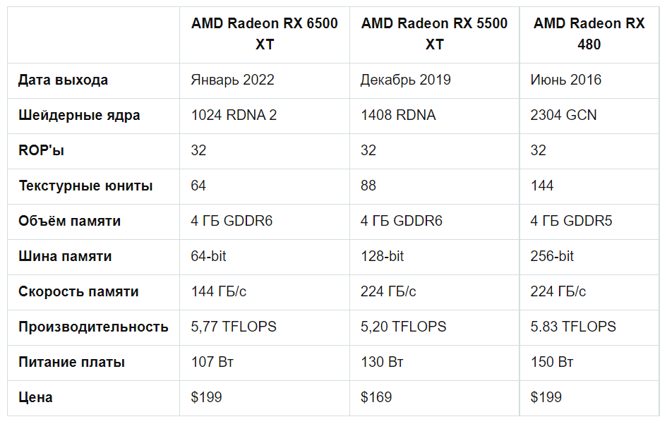 Вероятно, это не единственная «оптимизация». Если посмотреть на технические характеристики RX 6500 XT, то бросается в глаза два отличия от RX 5500 XT, видеокарты предыдущего поколения: