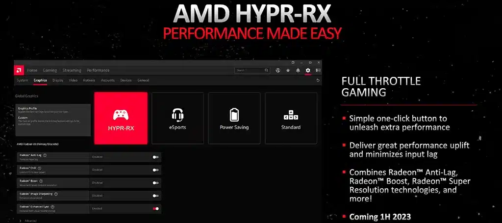 Вместе с видеокартами Radeon RX 7000 компания AMD анонсировала технологию HYPR-RX. Она позволяет одним кликом значительно улучшить кадровую частоту и снизить задержки благодаря совместной работе сразу трёх эксклюзивных технологий: Radeon Super Resolution, Radeon Boost и Radeon Anti-Lag. Сейчас их активировать можно только по отдельности.