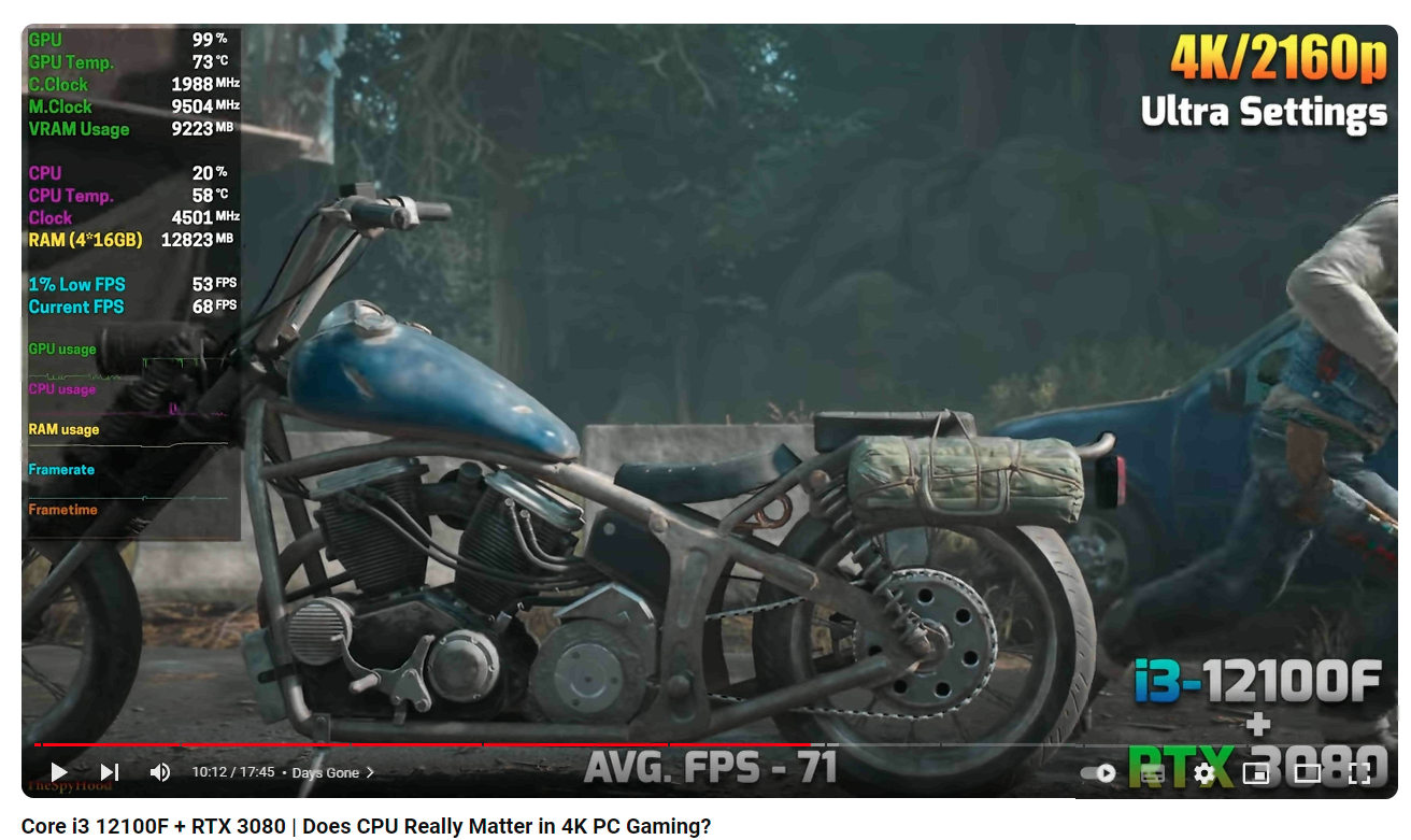 Купил себе летом i3-12100f за 8000 рублей, все работает и летает в 4к с видеокартой GeForce RTX 3080 Ti 12 ГБ.