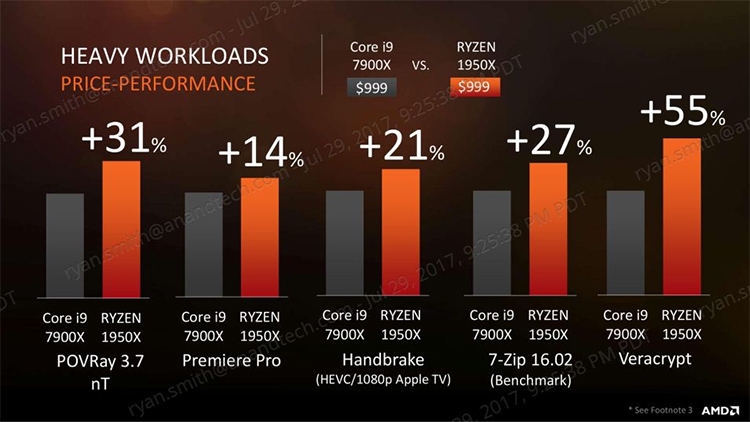 В рамках презентации AMD показала внутренние результаты тестирования HEDT-процессоров. Согласно собственным данным компании, 16-ядерный Ryzen Threadripper 1950X обгоняет 10-ядерный Core i9-7900X на величину от 14 до 55 процентов, несмотря на то, что оба чипа оценены производителями в $1000.