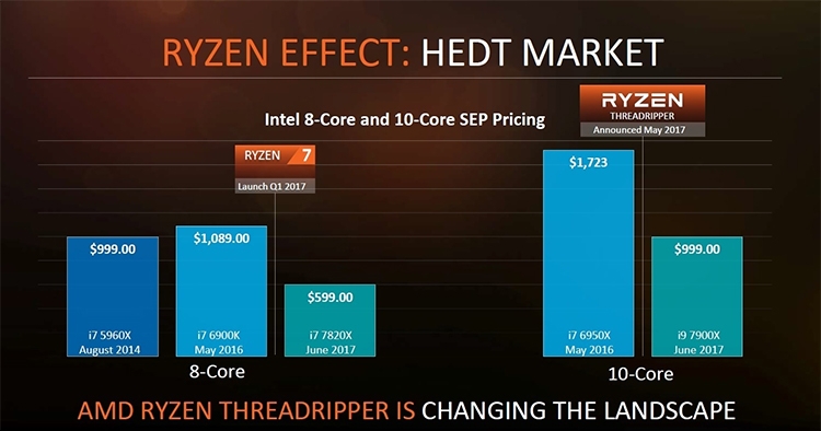 Рассказывая о Ryzen Treadripper 1900X, старший вице-президент AMD, Джим Андерсон (Jim Anderson), подчеркнул: «Мы не обрезаем функции младших моделей», — очевидно, указывая на то, что даже стартовая модель процессора для Socket TR4 имеет полный набор линий PCI Express и каналов памяти. Интеловские же HEDT-процессоры, напротив, к начальным моделям планомерно снижают число поддерживаемых линий PCI Express. Например, даже восьмиядерный Core i7-7820X обладает лишь 28 линиями. Кроме того, Андерсон намекнул, что AMD заставила микропроцессорного гиганта пойти на целый ряд ответных мер: «Threadripper уже принёс огромную пользу для конечных потребителей, несмотря на то, что на рынок он ещё не пришёл. Вот что значит конкуренция».