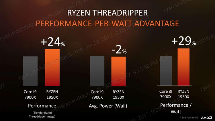 Более того, быстрее чем Core i9-7900X работает и 12-ядерный Threadripper 1920X, хотя его цена на $200 ниже. Попутно AMD указала на то, что несмотря на установленный в 180 Вт тепловой пакет, Threadripper при решении типовых задач потребляет меньше энергии по сравнению с Core i9-7900X.