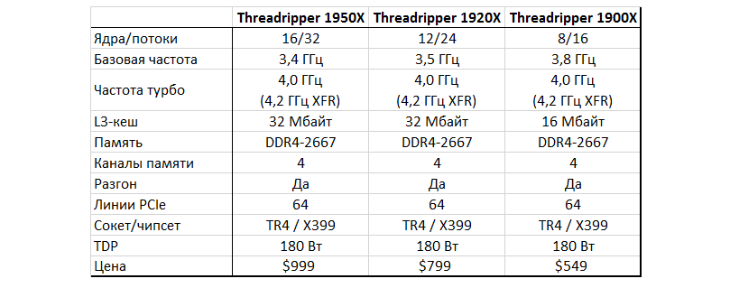 Младший Ryzen Treadripper 1900X получит 8 ядер и способность обрабатывать 16 потоков и будет стоить $549. Некоторые характеристики Treadripper 1900X перекликаются с Ryzen 7 1800X, но HEDT-процессор ориентирован на платформу Socket TR4 и работу с чипсетом X399, что означает поддержку 64 линий PCI Express (против 20) и четырёх каналов DDR4 SDRAM (против двух).