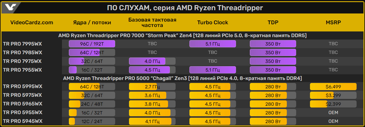 Вместе с архитектурой Zen 4 Threadripper 7000 перейдут на оперативную память стандарта DDR5, и конечно новый сокет. Известные технические характеристики собраны в таблице: