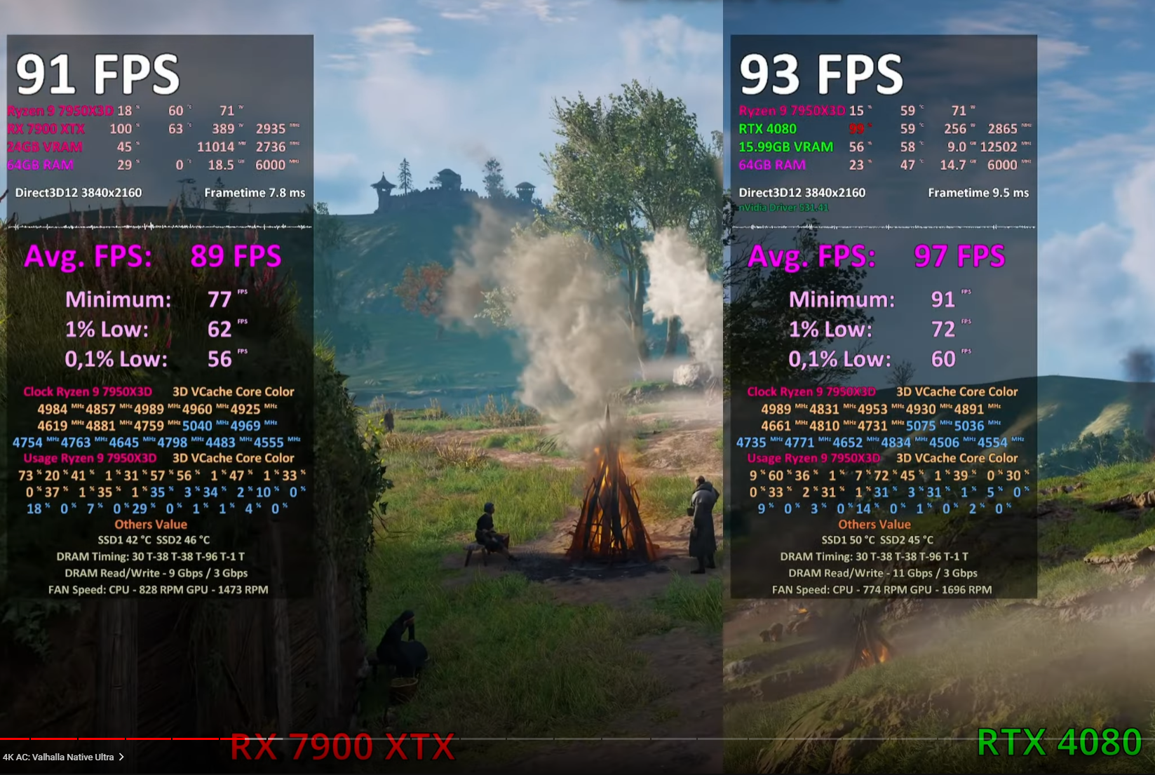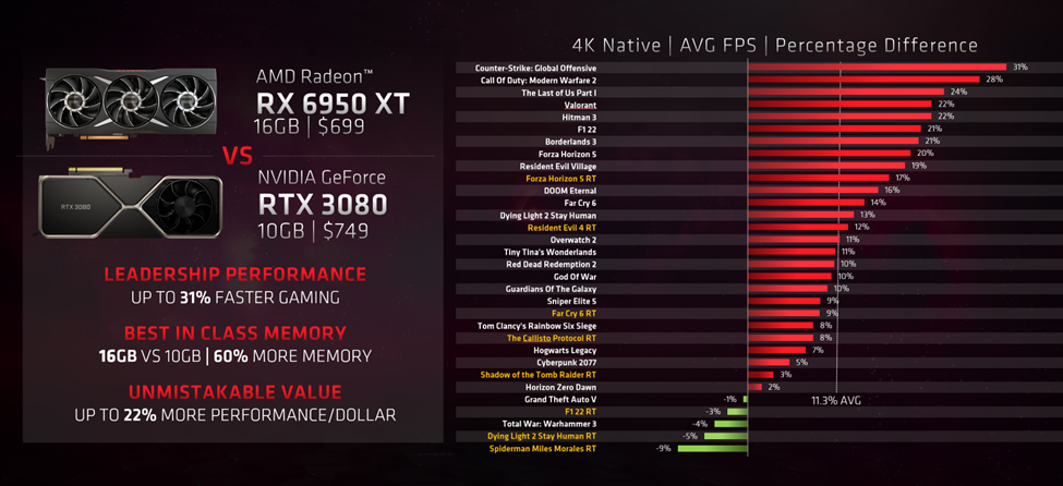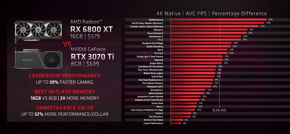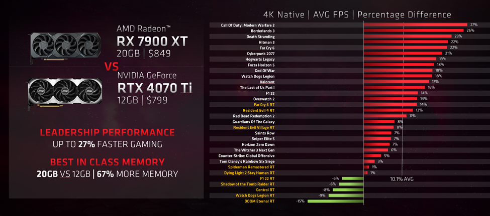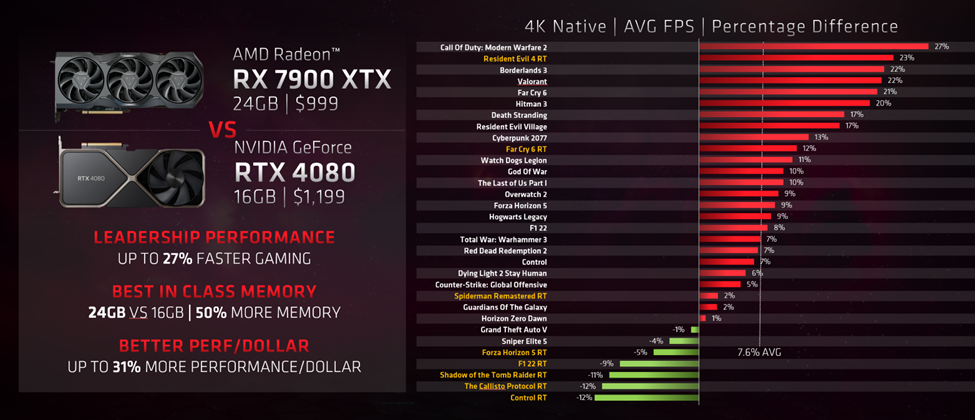 В попытке доказать свою точку зрения AMD предоставила несколько собственных сравнений с чипами Nvidia, сравнив RX 6800 XT с RTX 3070 Ti от Nvidia, RX 6950 XT с RTX 3080, 7900 XT с RTX 4070 Ti, а RX 7900 XTX с RTX 4080. В каждой из них было 32 "избранные игры" в разрешении 4K. Неудивительно для бенчмарков, опубликованных AMD, что графические процессоры Radeon победили в большинстве случаев. Вы можете увидеть их в галерее ниже: