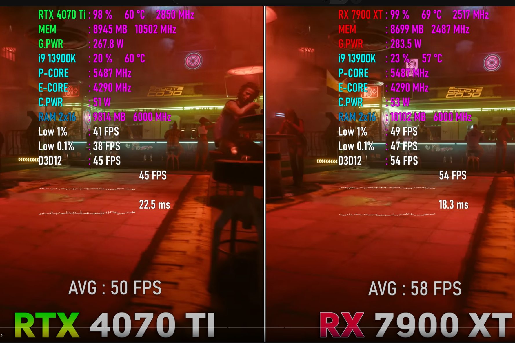4070 ещё не вышла же. ти может? Ну а аналога 4080 как бы и нет) Ну типа 7900хтх аналог, но хз-хз. Ну вот в целом разница не велика 267 и 283 ват. у 4070ти и 7900хт. При этом фпс 50 и 58... Да-да с лучами 7900 откиниться без фср, но и 4070 ти без длсс там не играбельные 42 даст, так что смысла так сравнивать и нет. А так 58 кадров в самом честном 4к.