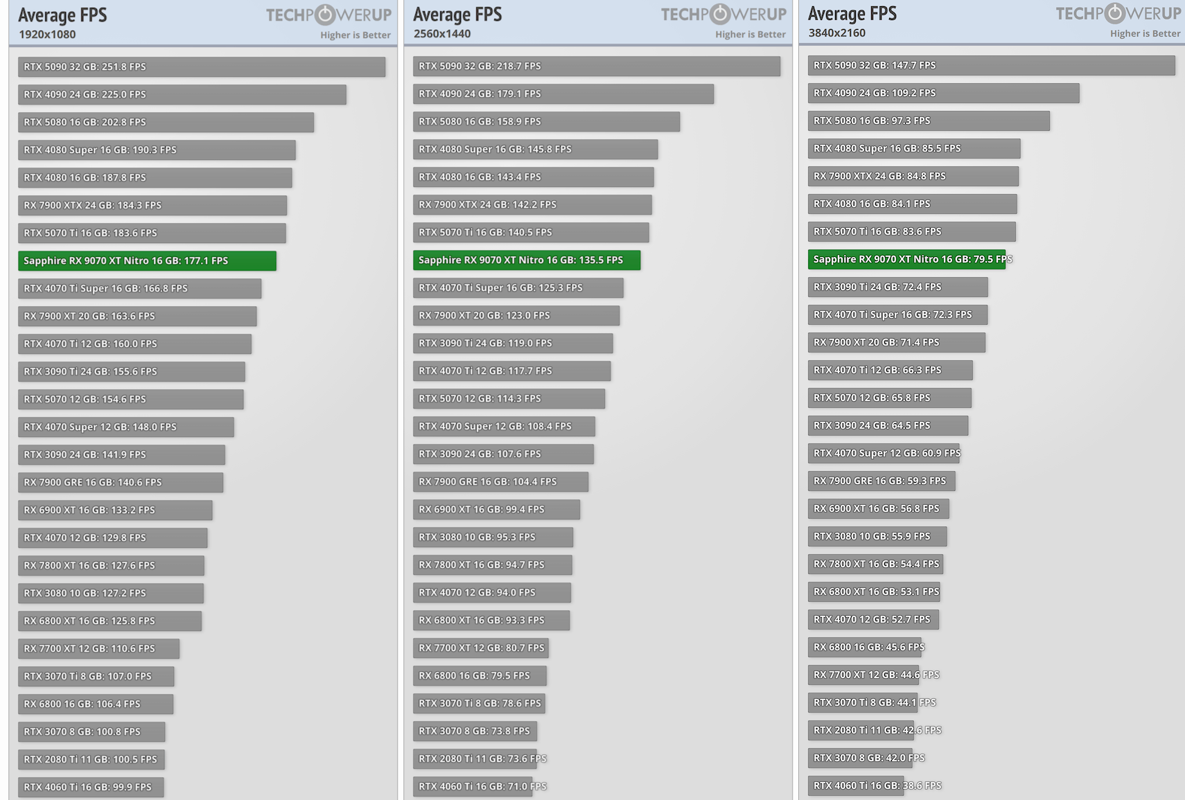 Цена на 5070 Ti начинается от 120 тысяч, а цена на 4070 Ti Super начинается от 100 тысяч. В итоге в среднем FPS без трассировки лучей 4070 Ti Super проигрывает 9070XT на 7%. С трассировкой лучей 4070 Ti Super выигрывает 9070XT на 4%. В итоге учитывая это все, видеокарты почти на равне, но видеокарта 4070 Ti заметно меньше потребляет. Вывод: Народный лидер среди видеокарт ~100 тысяч - это 4070 Ti Super.