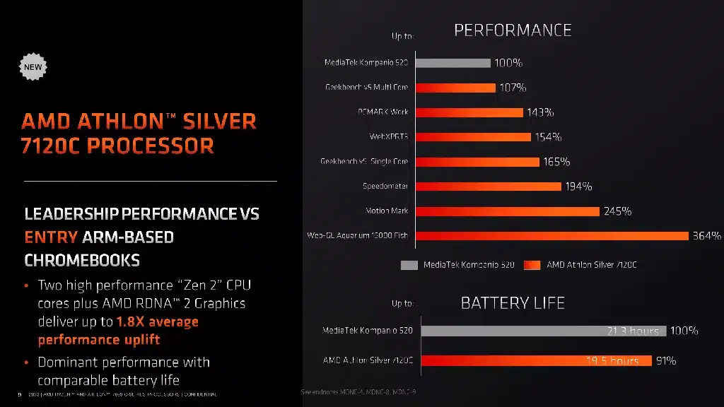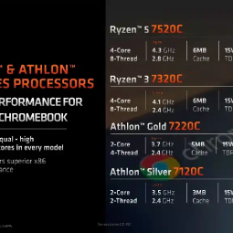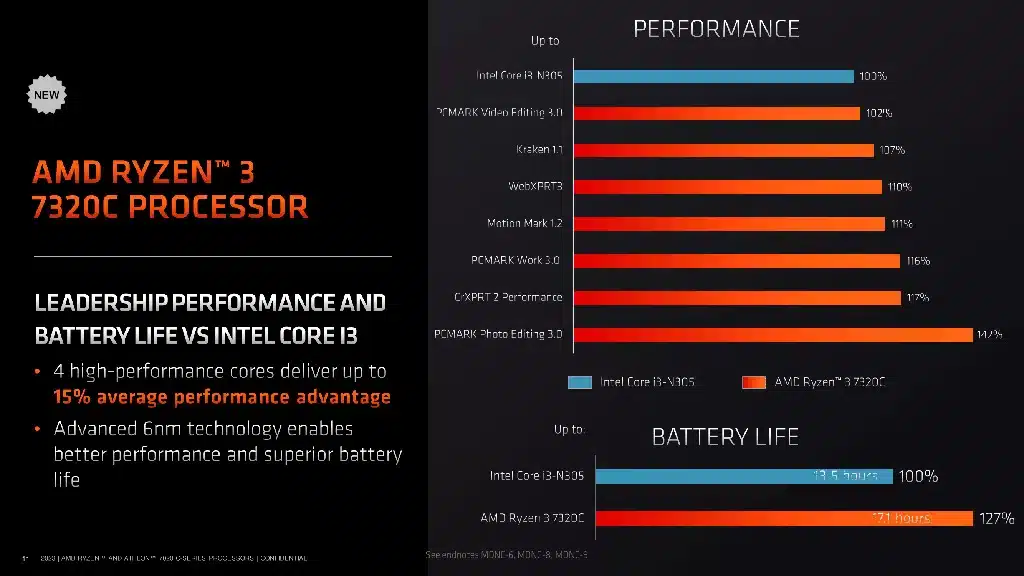 По заявлениям AMD, в зависимости от модели Ryzen 7020C обеспечивают до 19,5 часов работы от аккумулятора (до 28% больше, чем у конкурентов). Старший Ryzen 3 7320 в 1,8 раза хромбуков начального уровня, и до 15% лучше быстрейших чипов MediaTek.