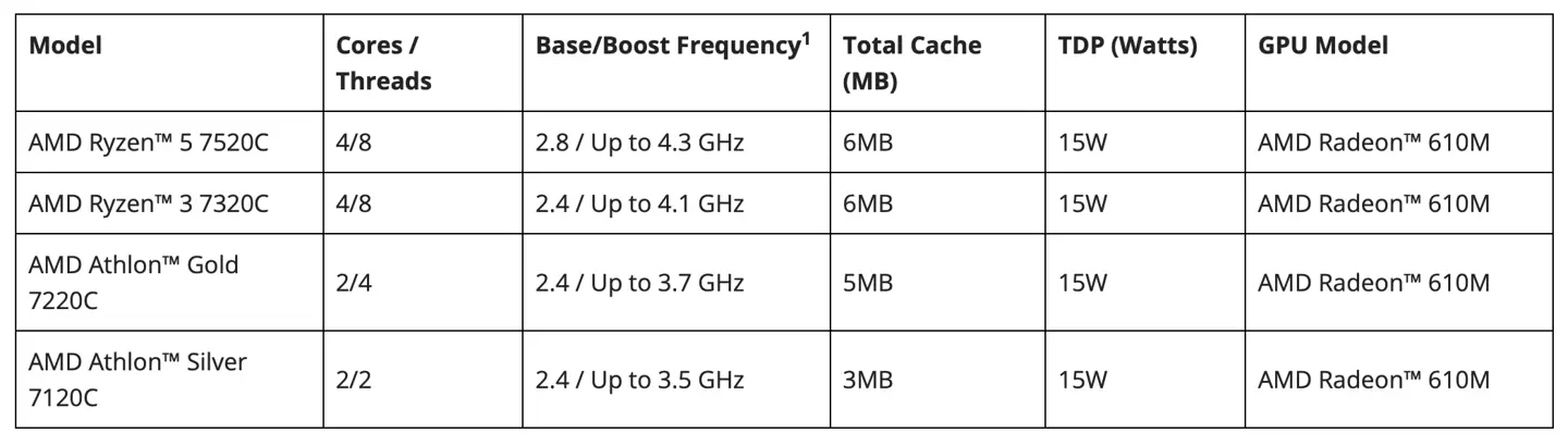Любопытно, что с технической точки зрения Ryzen 7020C можно назвать устаревшими. Ядра базируются на архитектуре Zen 2, а встроенная графика на RDNA 2-го поколения. Однако, для производства задействуется современный 6-нм техпроцесс.
