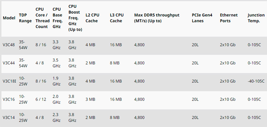 Всего в линейку вошли 5 моделей с уровнями TDP 15 или 45 Вт, один из вариантов рассчитан на использование при отрицательных температурах. Поголовно все модели получили 2-канальный контроллер памяти DDR5-4800, 20 линий интерфейса PCI-E 4.0, пару 10-гигабитных Ethernet, россыпь USB (включая USB 4.0) и другие интерфейсы. Более детальные спецификации в таблице.