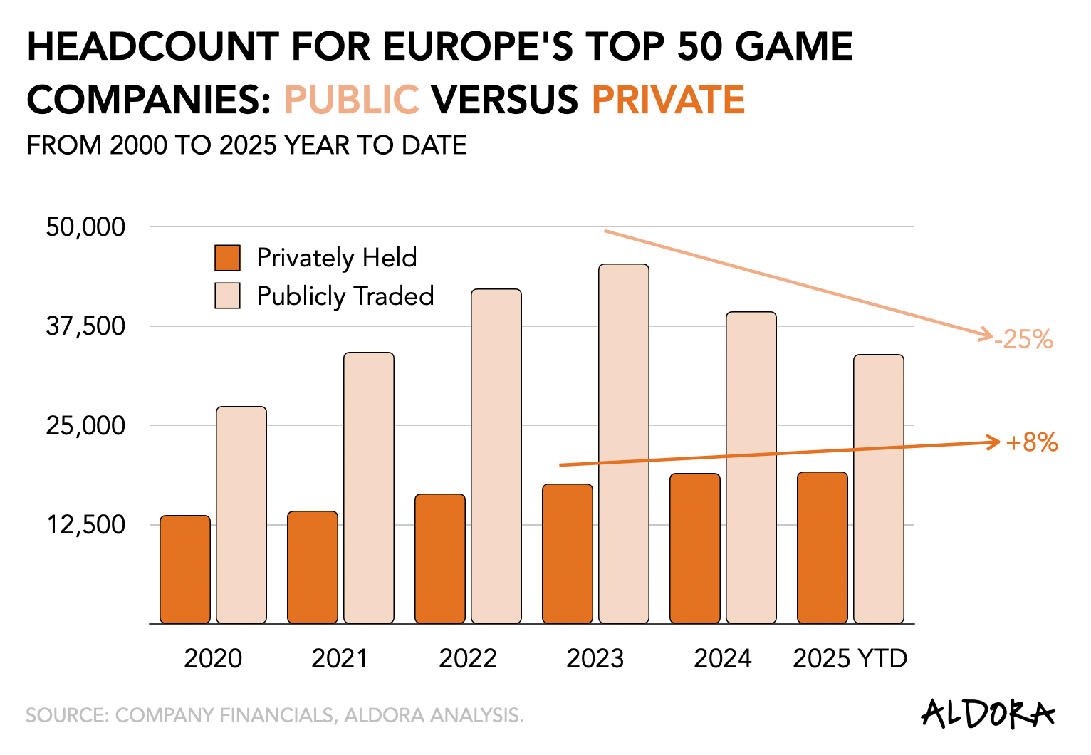 К публичным компаниям относятся те, чьи акции доступны на фондовой бирже, например, Ubisoft и CD PROJEKT. Все остальные считаются частными. Согласно наблюдениям аналитика, с 2023 года совокупный штат исследованных частных компаний вырос на восемь процентов. В то же время у публичных компаний он сократился на четверть.