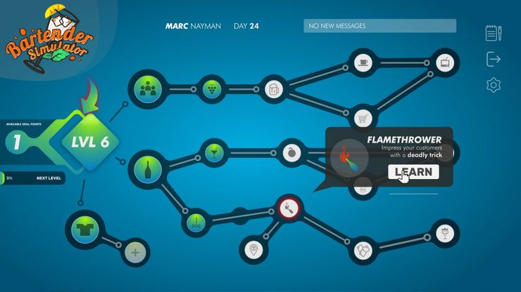 В Bartender Simulator будет система диалогов, пока вы готовите напитки для своих гостей. По словам разработчика, можно шутить и вспоминать анекдоты. Вы также можете поразить их трюками, открыв эти способности через дерево навыков. В игре вы можете разблокировать такие способности, как жонглирование бутылками и зажигательные напитки.