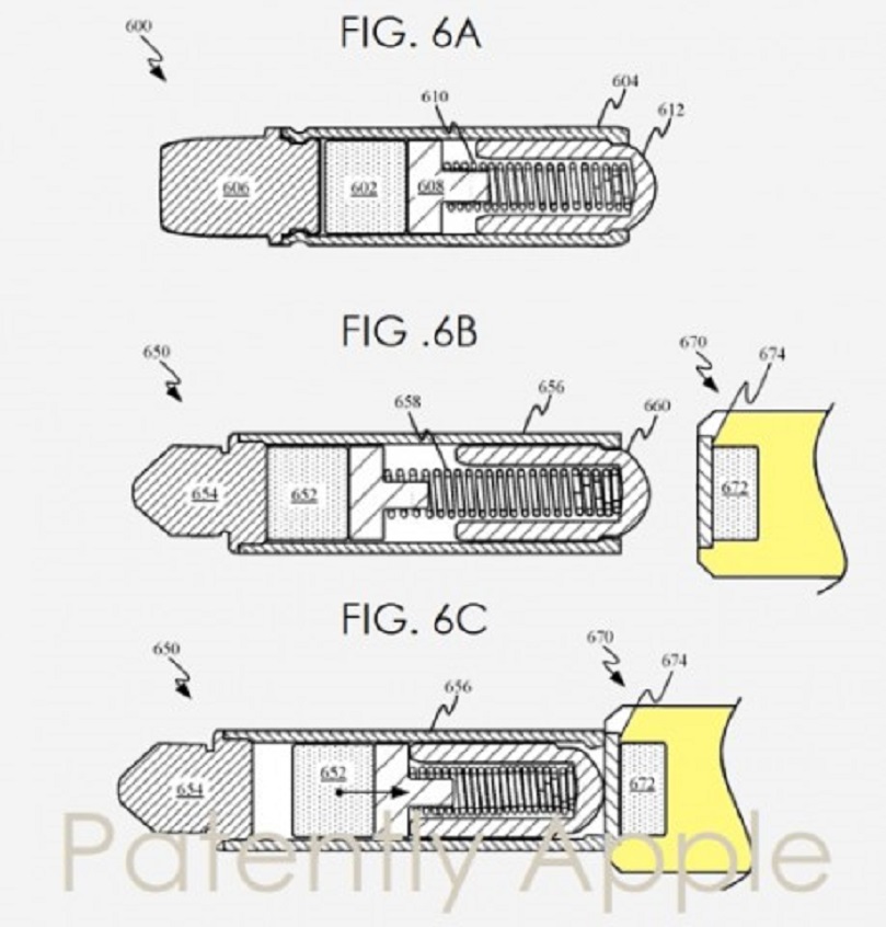 В новом патенте компания Apple сфокусировала внимание на новом типе коннекторов с «магнитно-управляемым соединителем, который содержит несколько плавающих контактов». Разъём имеет множество пружинных смещений, расположенных линейно.