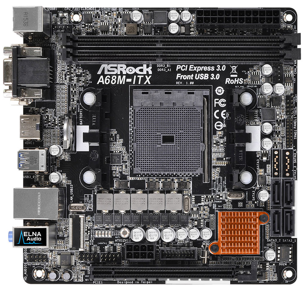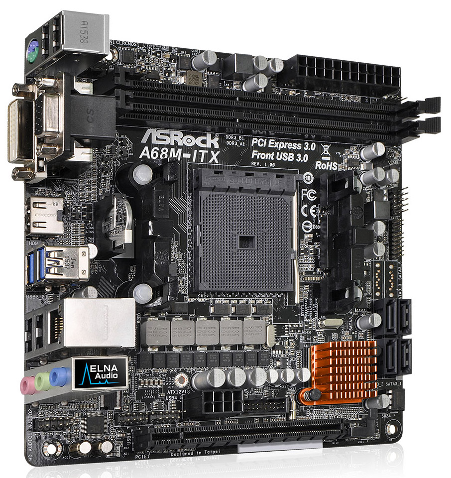 В состав ASRock A68M-ITX входят пять фаз питания процессорного гнезда (дополнительный силовой разъем — EPS12V), разъем PCI Express 3.0 x16 для дискретной видеокарты, два слота для оперативной памяти DDR3-1066/.../2400, четыре порта SATA 6 Гбит/с (поддерживаются RAID 0, 1 и 10), контроллеры Realtek RTL8111GR и ALC887 (сеть и звук соответственно). Кроме того, имеются два 4-контактных разъема для вентиляторов, штырьковые USB 3.0 и USB 2.0 (2). Наличие слотов Mini PCI-E/mSATA, M.2 и адаптера Wi-Fi не предусмотрено, отсутствует и радиатор на элементах VRM.