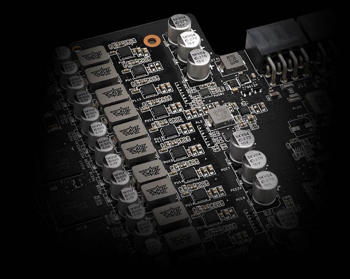 Карта может похвастаться мощной, но тихой фирменной системой охлаждения DirectCU III с тремя вентиляторами, 14-фазным стабилизатором питания с фирменными дросселями Super Alloy Power II и повышенной до 1317 МГц (в турборежиме) тактовой частотой. Память тоже подверглась заводскому разгону и работает на эквивалентной частоте 7200 МГц, что нетипично — обычно производители карт память предпочитают не разгонять.
