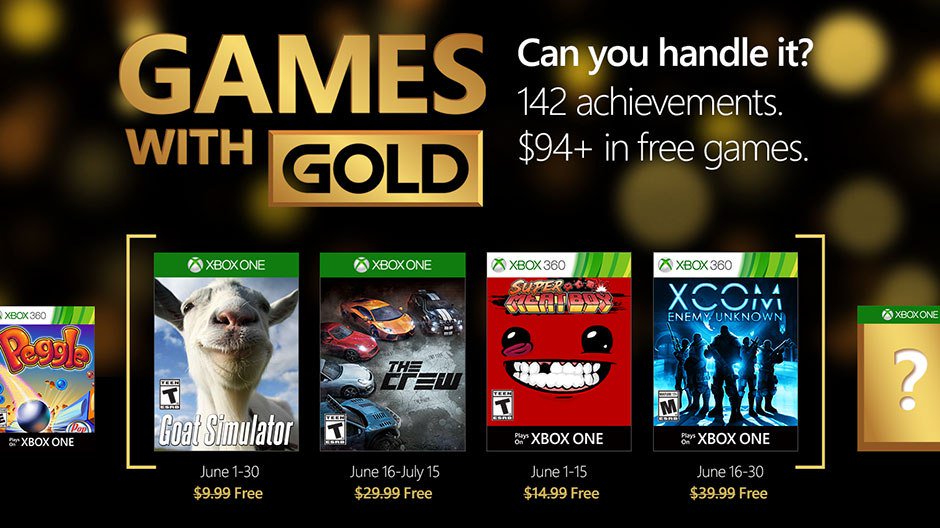 Бесплатные игры для подписчиков Xbox Live Gold в июне! gggxz 24 мая 2016 Подписчики Xbox Live Gold получат уже в июне: Goat Simulator (XOne) The Crew (XOne) Super Meat Boy (XOne, X360) XCOM: Enemy Unknown (XOne, X360)