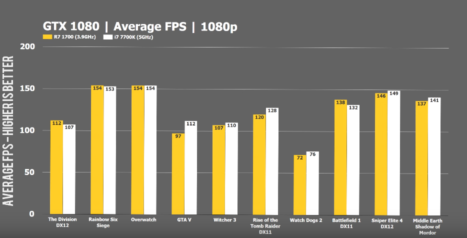 А вот в играх, пока ограниченно поддерживающих многопоточность, ситуация иногда совершенно иная. В одних тестах даже самый младший Ryzen 1700 составляет конкуренцию i7 7700k (5 ГГц), а в других, даже топовый 1800x отстает не только от 7700k, но и от «неигровых» 69xx.