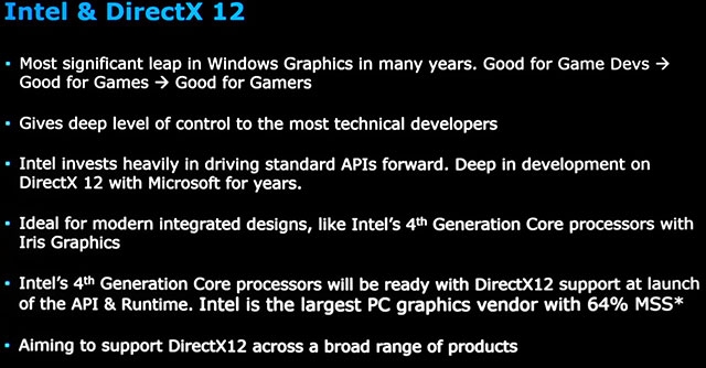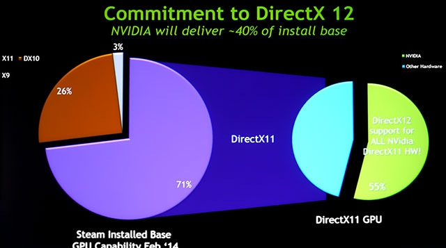 Важно отметить, что все видеокарты AMD с архитектурой GCN получат поддержку стандарта DirectX 12. Intel тоже заявила о поддержке стандарта в своих процессорах Haswell (впрочем, с оговоркой: это касается только графики Iris и Iris Pro). Владельцам карт NVIDIA повезло больше остальных: DirectX 12 будут поддерживать не только современные карты с архитектурами Kepler и Maxwell, но и старые ускорители Fermi (выпускавшиеся с 2010 года) по сути все видеокарты GeForce класса DX11 получат поддержку нового стандарта. Впрочем, возможно, речь идёт лишь о частичной поддержке для старых ускорителей.