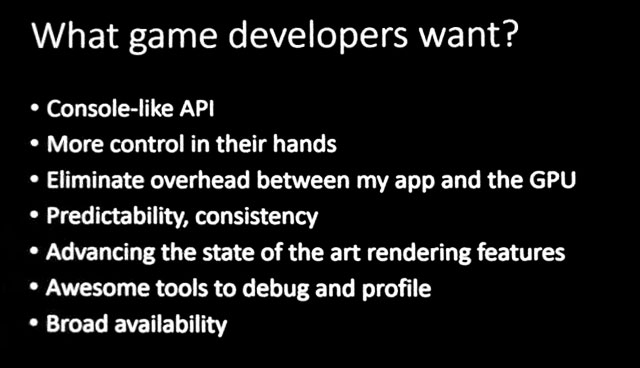 Разработчики давно запрашивали эффективный API, который позволил бы на более низком уровне управлять аппаратными ресурсами GPU. Несмотря на существенные улучшения в предыдущих версиях API, игры нового поколения требуют максимальной отдачи от многоядерных систем. Всё это Microsoft учла при создании DirectX 12, работа над которым началась более четырёх лет назад.