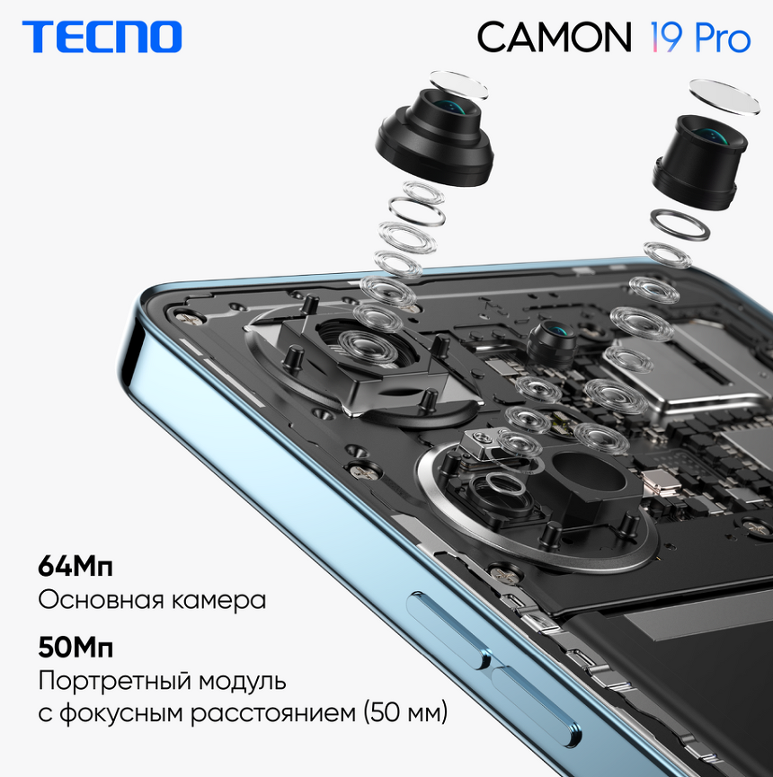 Camon 19 оснащен флагманской основной камерой 64 Мп со светочувствительным модулем RGBW, экраном 6,8" FHD+ и энергоемким аккумулятором 5000 мАч.