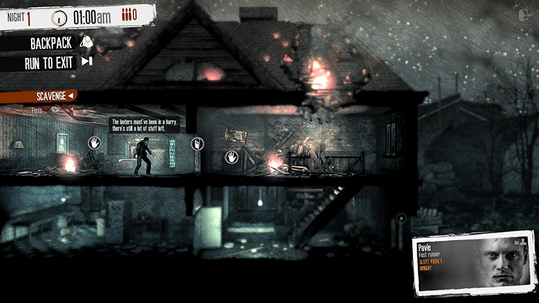 А есть еще This War of Mine — мрачная игра о мирных людях, которые попали в зону боевых действий. Она позволяет тебе самому создать запоминающийся и интересный сюжет. И все за счет двух скомбинированных жанров — сурвайвала в духе Don’t Starve и симулятора в духе The Sims.