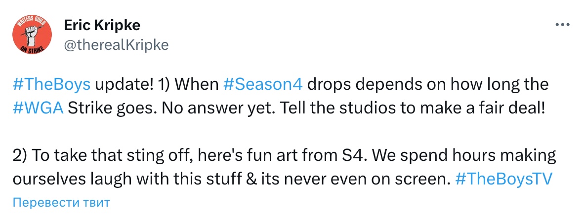 «Премьера четвертого сезона «Пацанов» зависит от того, как долго продлится забастовка Гильдии сценаристов Америки. Ответа пока нет. Скажите студиям, чтобы они заключили честную сделку!»
