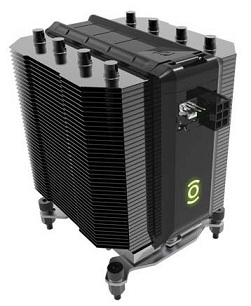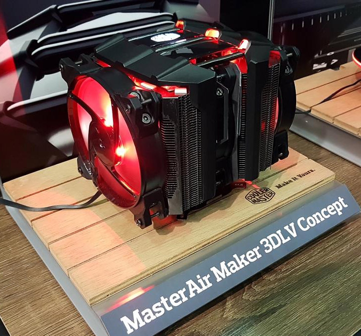 Без массивного воздушного кулера Cooler Master обойтись не могла, поскольку всерьёз рассчитывает на покупателей из числа энтузиастов. Прототип MasterAir Maker 3DLV состоит из испарительной камеры в основании, тепловых трубок, двухсекционного алюминиевого радиатора и трёх вентиляторов. Визуально этот кулер крупнее предшественника MasterAir Maker 8.