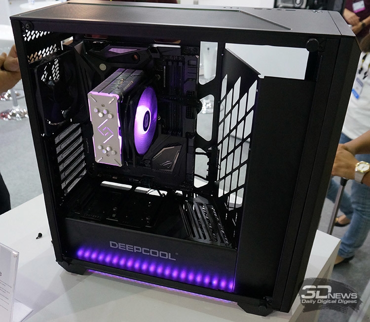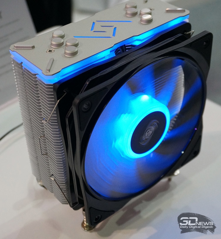 На фото выше изображён ещё один герой данной заметки — кулер башенного типа Deepcool Gammaxx GT, один из новых продуктов китайской компании. Охладитель состоит из четырёх U-образных медных тепловых трубок диаметром 6 мм (формируют основание кулера), массива перфорированных алюминиевых пластин и подсвечиваемого 120-мм вентилятора. Последний работает в режиме от 500±150 до 1500±150 об/мин. К Gammaxx GT прилагаются контроллер подсветки и крепления для платформ AMD и Intel, включая AM4, LGA115x и LGA2011-3. Габариты кулера составляют 135(Д) × 84,8(Ш) × 156(В) мм, масса — 870 г.