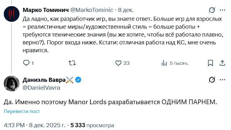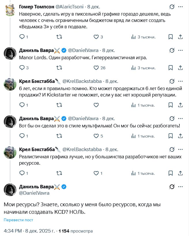 В комментариях под публикацией пользователи попытались возразить Вавре, указывая на экономический аспект. Игроки и коллеги по цеху отметили, что создание гиперреалистичной графики требует огромных бюджетов и штата сотрудников, чего часто нет у инди-разработчиков. Однако Даниэль отверг эти доводы. Он назвал засилье упрощенной стилистики модой, клише и копированием трендов, а не вынужденной мерой. В качестве доказательства он вновь вспомнил Manor Lords, которую разрабатывает всего один человек, и сослался на свой опыт создания Kingdom Come: Deliverance, которую его команда начинала делать с нулевыми ресурсами.