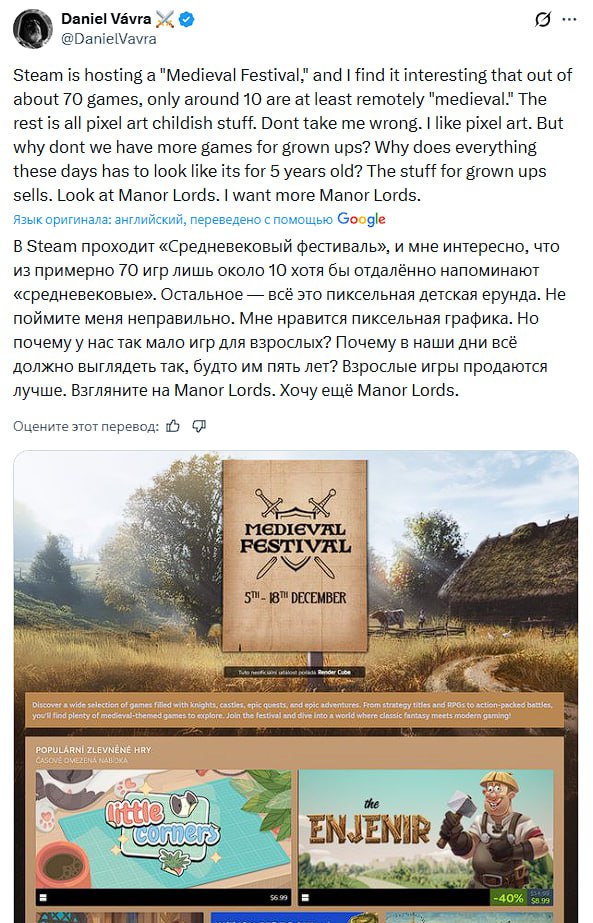 Вавра отметил в социальных сетях, что из примерно семидесяти представленных на главной странице события игр лишь около десятка можно хоть как-то отнести к категории средневековых. Абсолютное большинство остальных проектов он охарактеризовал как пиксельную детскую ерунду. Геймдизайнер подчеркнул, что он не испытывает неприязни к пиксель-арту как таковому, но искренне не понимает, почему современная индустрия выпускает так мало игр для взрослой аудитории. По его мнению, сейчас многие проекты выглядят так, словно они создавались для пятилетних детей. В качестве примера того, что он хотел бы видеть чаще, Вавра привел стратегию Manor Lords, сочетающую реалистичную графику и средневековый сеттинг.