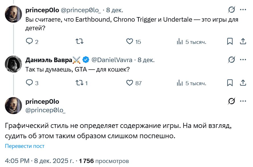 Дискуссия также коснулась восприятия визуального стиля. Комментаторы спросили, считает ли Вавра культовые игры вроде Undertale или Chrono Trigger продуктами для детей исключительно из-за их внешнего вида. Геймдизайнер ответил встречным вопросом о том, является ли GTA игрой для кошек. В итоге Вавра обвинил критиков в неумении понимать прочитанное, заявив, что он не выступал против стилизации как таковой, а лишь выразил недовольство отсутствием серьезных игр для взрослой аудитории на профильном фестивале.
