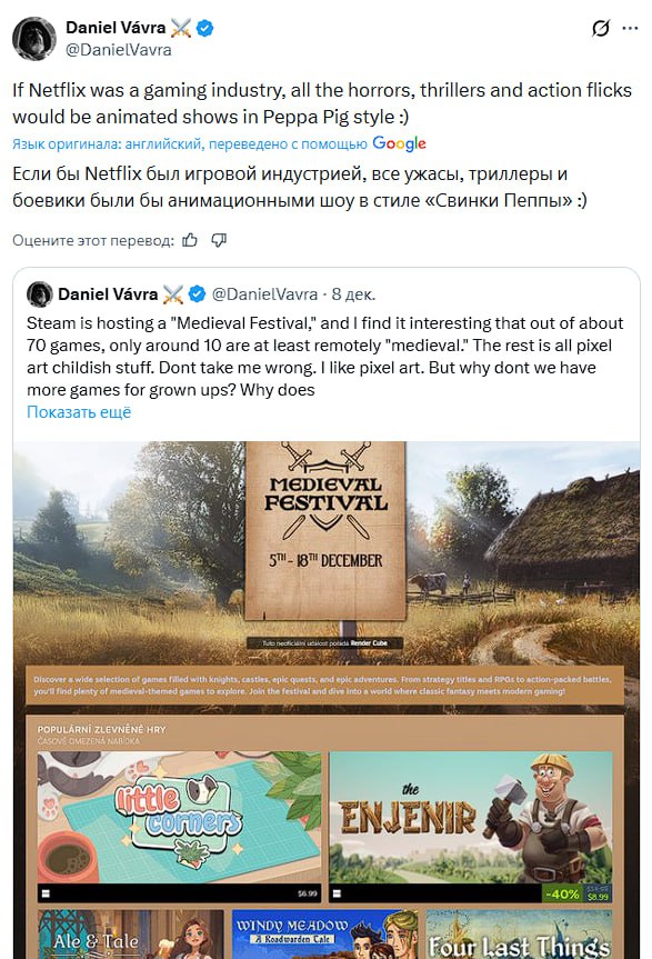 Известный геймдизайнер и сценарист Даниэль Вавра, подаривший индустрии первую Mafia и ролевую игру Kingdom Come: Deliverance, остался недоволен текущим наполнением цифрового магазина Valve. Внимание разработчика привлек проходящий сейчас Средневековый фестиваль в Steam, ассортимент которого показался ему несоответствующим заявленной тематике и слишком инфантильным.