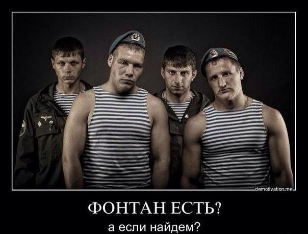 День ВДВ (день Десантника) один из самых популярных военных праздников то ли десантников много, то ли они особенные люди, раз каждый год во всех городах 2 августа проводится так много праздничных мероприятий, а именно - жрать водку на жаре запивая пивом, орать и матерится невзирая на то, что рядом женщины и дети, купание в фонтанах с разбиванием пустых бутылок об свою пустуюголову. Вообщем с праздником.
