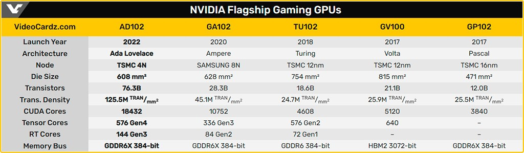 NVIDIA AD102 производится по 4-нм техпроцессу TSMC N4 и насчитывает 76,3 млрд транзисторов. Площадь чипа составляет 608 мм2. Относительно предшественника (GA102), выпускающегося по 8-нм техпроцессу Samsung, графический процессор имеет на 70% больше транзисторов, а площадь немного сократилась (628 мм2 у GA102).